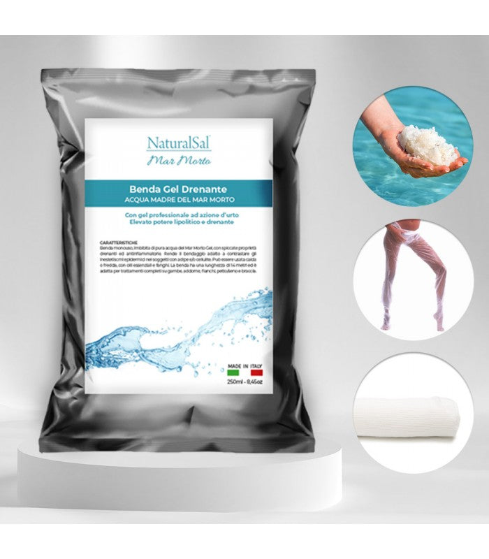 Benda monouso imbevuta di gel cosmetico a base di Sale del Mar Morto, pensata per un trattamento estetico localizzato che dona alla pelle un aspetto più tonico, levigato e uniforme. La texture fresca e la pratica applicazione a fasciatura trasformano il rituale in un momento di comfort e benessere per le aree soggette a rilassamento cutaneo e irregolarità dell’aspetto.