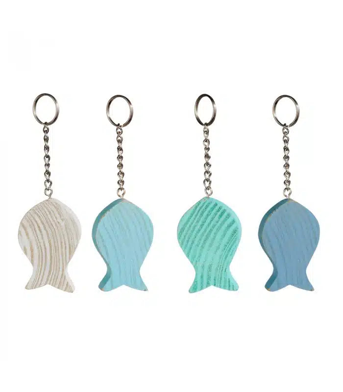 Portachiavi realizzato in legno e metallo, disponibile in quattro varianti di pesci dipinti a mano. Un accessorio pratico e decorativo che unisce funzionalità e stile marinaro, perfetto per custodire le chiavi con un tocco originale e colorato.