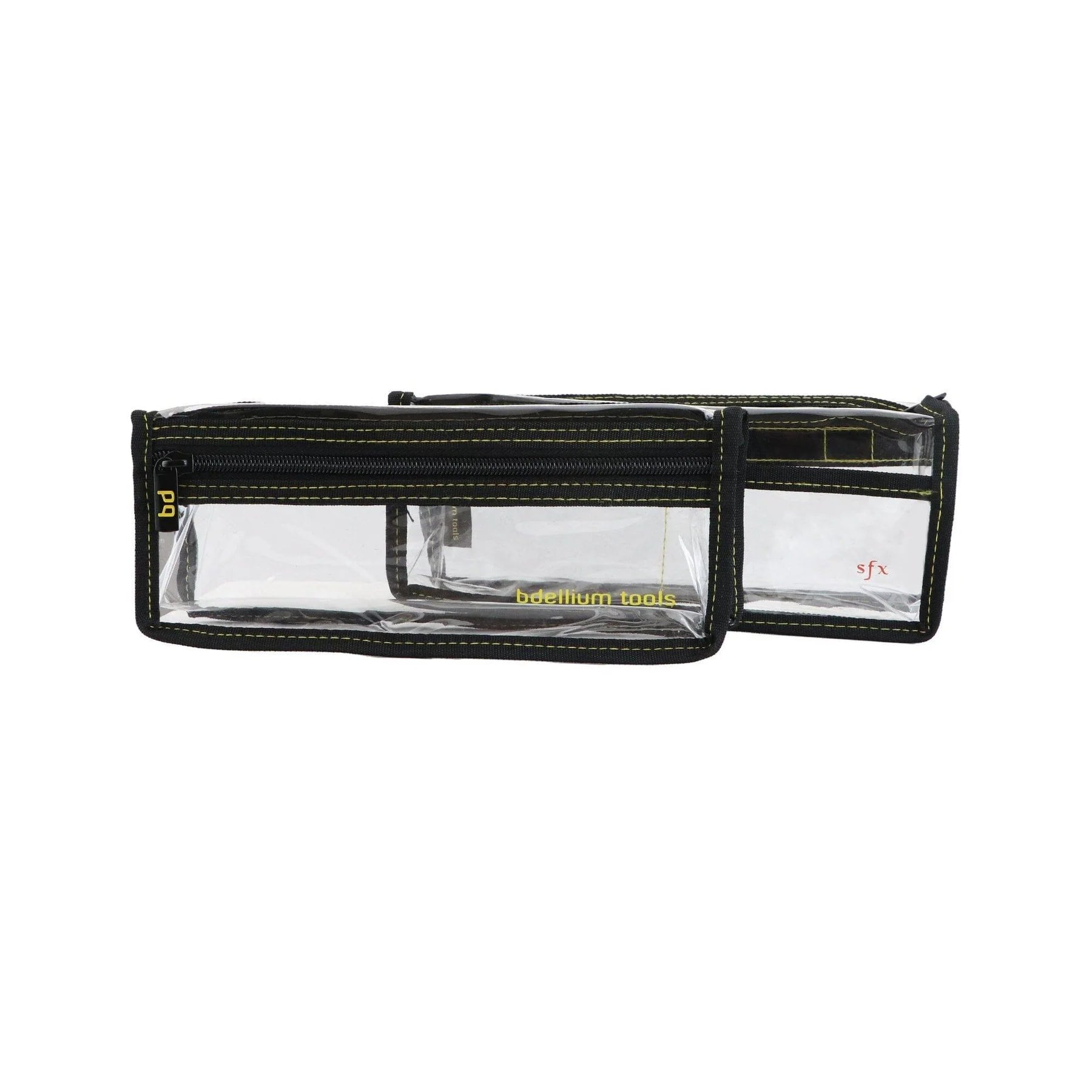 Questa Double Pouch è pensata per contenere i pennelli della serie Bdellium Tools SFX. La SFX Double Pouch, parte della linea SFX di Bdellium Tools, è progettata appositamente per aiutarti a trasportare i pennelli e gli strumenti indispensabili per il tuo lavoro. Questo articolo può essere separato in 2 pouch singole oppure unito grazie ai 2 set di chiusure in velcro. Una volta combinate, le due pouch offrono 3 tasche con chiusura a zip rinforzata in metallo e 2 tasche laterali aperte per oggetti più piccoli o di uso quotidiano. Le pouch sono realizzate in plastica trasparente e flessibile per permettere, con un semplice sguardo, di identificare i pennelli e gli strumenti presenti.
