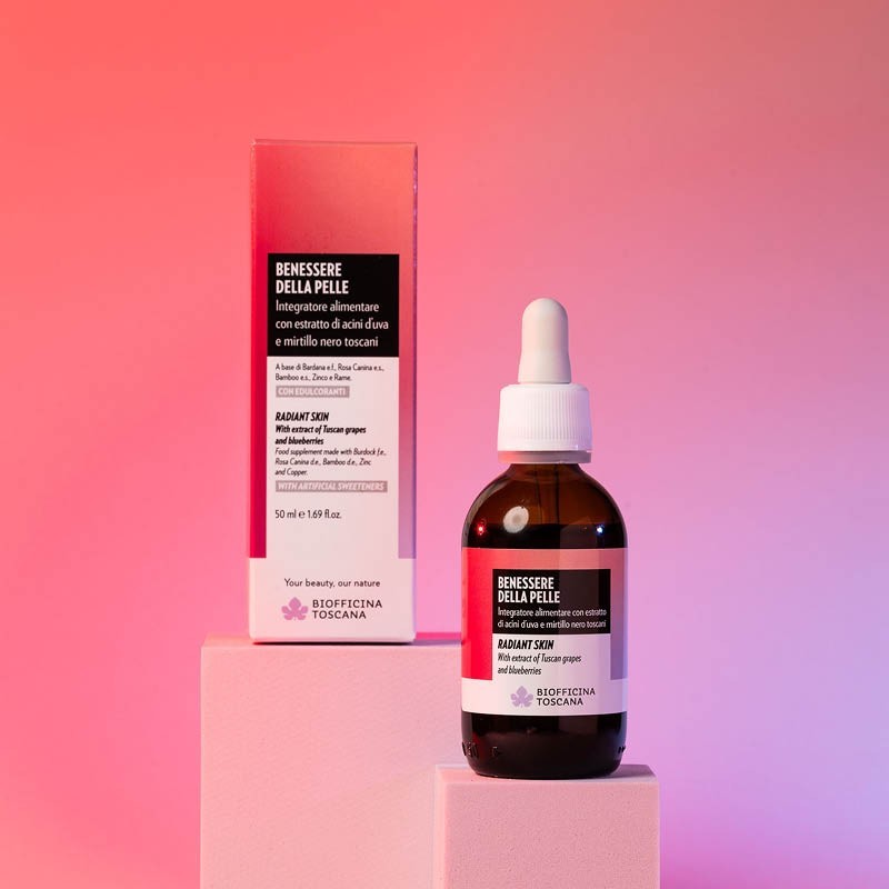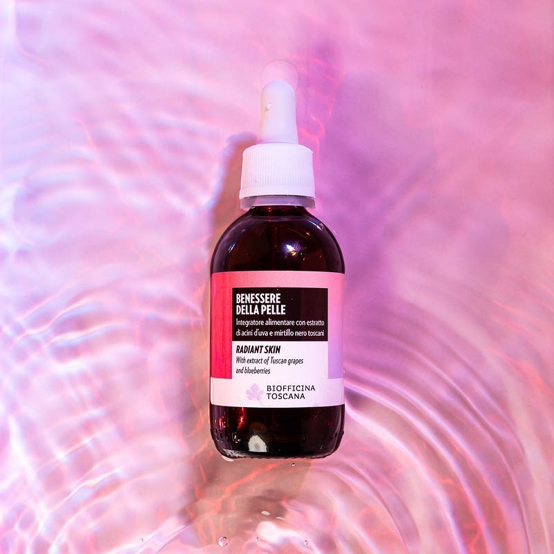 Il Benessere della Pelle di Biofficina Toscana è un integratore alimentare liquido formulato con ingredienti di origine naturale, pensato per arricchire la routine quotidiana con sostanze utili al mantenimento dell'equilibrio cutaneo.
