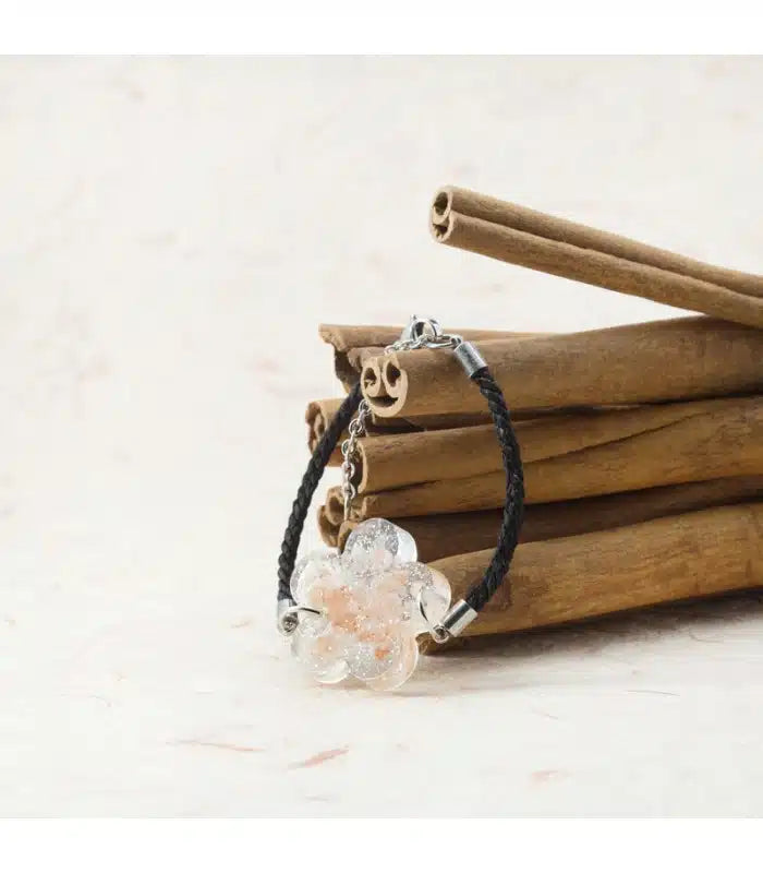 Bracciale artigianale della linea Preziosi di Sale firmata NaturalSal, realizzato a mano con Sale Rosa dell’Himalaya purissimo, resina e argento 925. Un gioiello unico che unisce stile ed eleganza al benessere naturale, completamente nichel free.