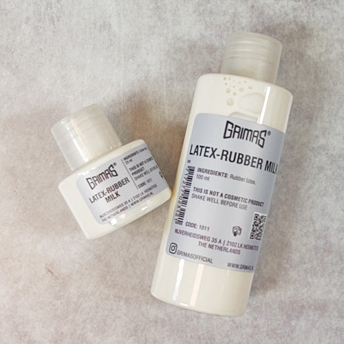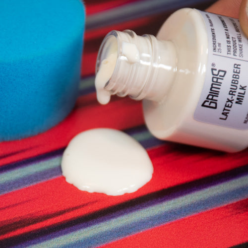 Grimas Latex-rubber Milk è un lattice naturale in forma liquida, bianco all’applicazione e trasparente dopo l’asciugatura. Viene utilizzato principalmente per creare effetti speciali come ustioni, cicatrici, pelle finta o per realizzare calchi in stampi di gesso. Disponibile in flaconi da 25, 100, 500 e 1000 ml.