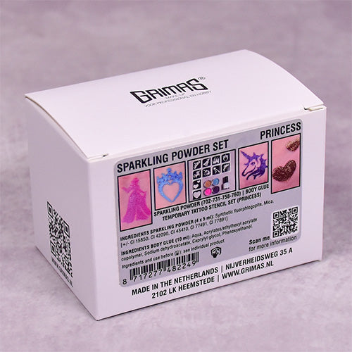Il set Grimas Princess Sparkling Powder unisce quattro tonalità luminose di Sparkling Powder (702, 731, 758, 760), Body Glue da 10 ml e uno stencil temporaneo tema Princess. Le Sparkling Powder sono polveri finissime, altamente pigmentate e con un delicato effetto shimmer. Completamente plastic-free, rappresentano un’alternativa sostenibile ai glitter tradizionali. Perfette per make-up scintillanti e per creare tatuaggi glitterati resistenti e definiti.