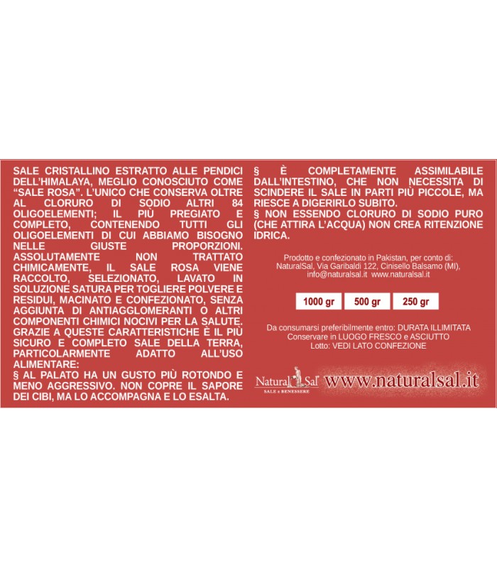 Il Sale Rosa dell’Himalaya NaturalSal è un minerale naturale, non raffinato, conosciuto per la sua composizione unica di oligoelementi come calcio, potassio, magnesio e ferro, che gli conferiscono la caratteristica colorazione rosata.