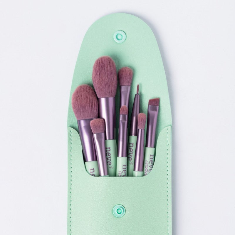 Contenuto in una resistente pochette in vegan leather verde menta, il set include otto pennelli professionali per viso, occhi e labbra, progettati per garantire massima versatilità e precisione: