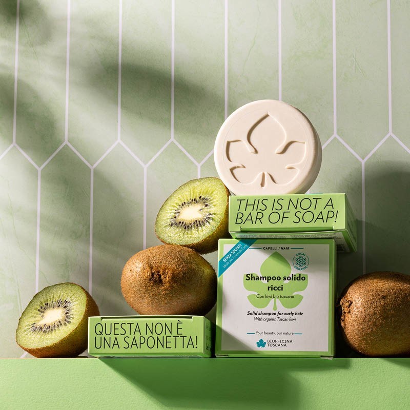“Shampoo solido ricci” non è un semplice sapone ma un innovativo e sostenibile detergente senza acqua, studiato per ridurre gli sprechi ed indicato per detergere i capelli ricci, con un pack plastic-free. È infatti formulato senza processo di saponificazione, come un vero e proprio detergente liquido ma senza acqua e non contiene solfati, questo lo rende ideale per i ricci e in particolare per il metodo Curly. Con delicati tensioattivi di origine vegetale, è arricchito da un estratto di kiwi bio toscano con proprietà antiossidanti-idratanti ed attivi districanti-emollienti, per un effetto riccio modellato. A contatto con l’acqua crea una morbida e piacevole schiuma che svolge una delicata azione districante sui capelli, lasciando i ricci elastici, morbidi e sprigionando un fresco profumo.