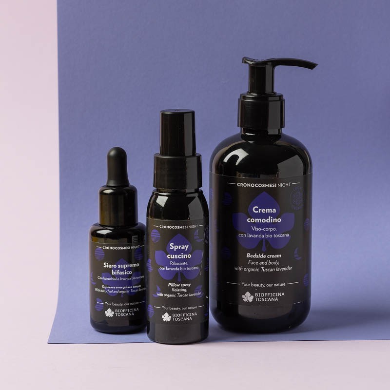 Queste preziose sostanze agiscono con lavanda bio toscana in un rituale di cura personale serale che rigenera corpo e mente lasciando una pelle tonica e piacevolmente profumata.